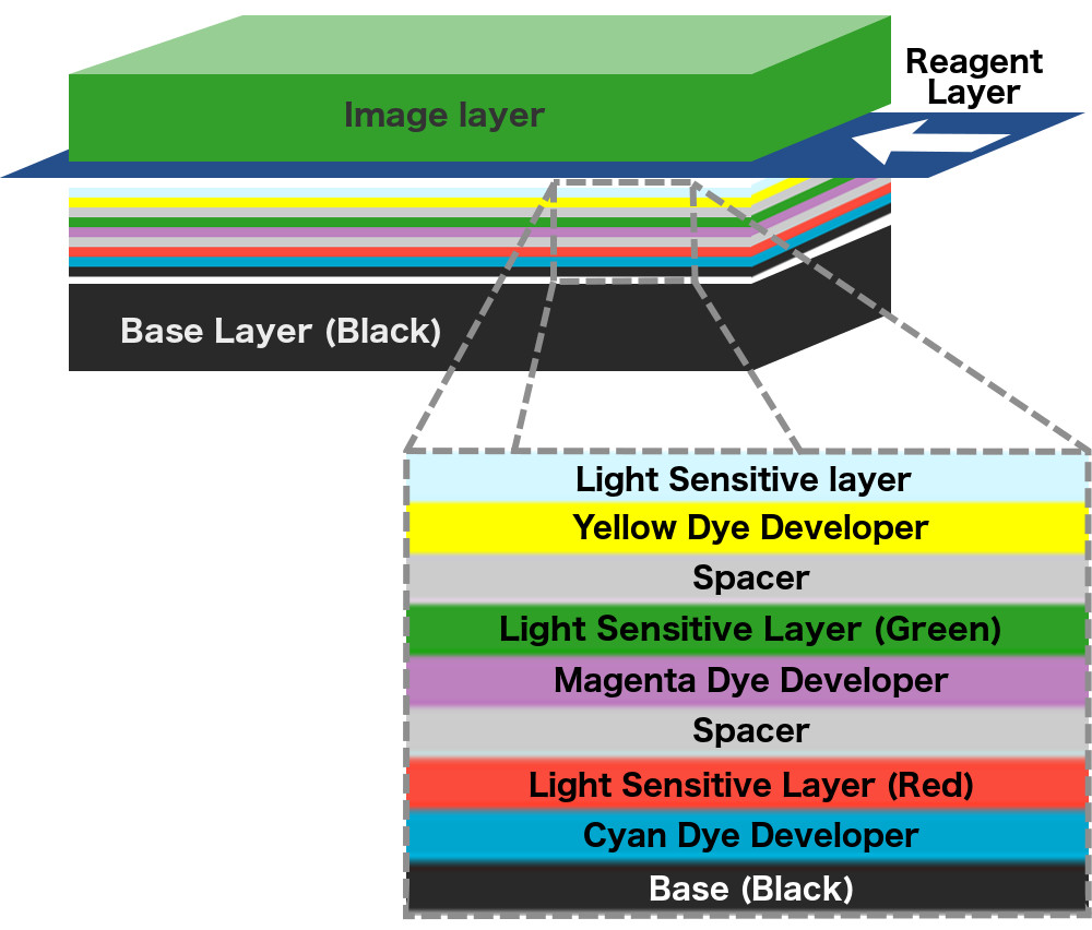 The same principle is used to develop colored pictures. While the process back then was carried out in labs, Land compressed the lab into the camera. Instant film is covered with not one but three silver halide coatings. The first coating (from up to down) responds to blue light, the second to green light, and the third to red light.